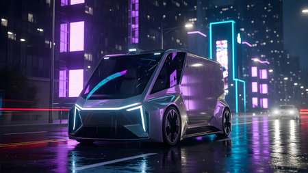 Futuristic autonomous electric delivery vehicle illuminating a rainy cyberpunk city street