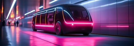A sleek autonomous vehicle illuminated by neon lights, showcasing innovative design in a futuristic setting
