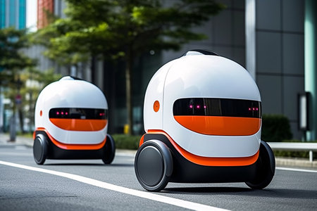 Two modern electric self-driving robots on the street. 3d rendering