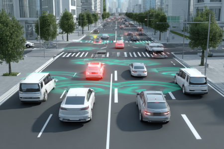 Vehicles navigate a city intersection with advanced traffic management technology shown by visual signals on the road.