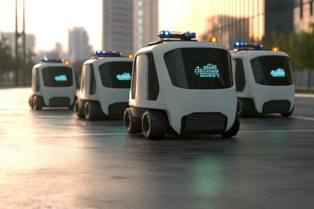 Robotic vehicles equipped with lights conduct patrols in an urban area at sunset, enhancing safety measures.