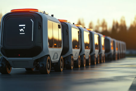 A line of sleek, self-driving vehicles awaits departure under a stunning sunset sky.