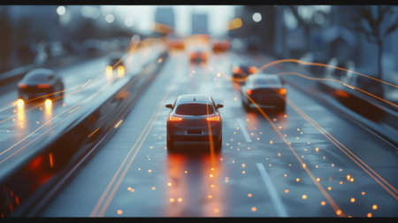 Futuristic self driving cars moving on a highway, demonstrating the concept of autonomous vehicles and automated driving systems with digital lines representing the technology in action