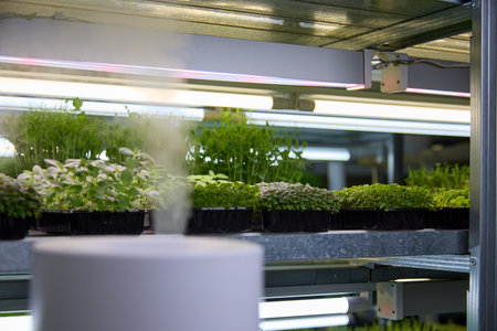On a green farm, a certain level of humidity is maintained using a sprayer. To humidify air and create special microclimate in greenhouse for growing microgreens, an automatic water sprayer is used.