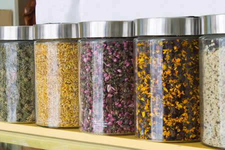 set of glass jars with different flowers, petals and herbs for aromatherapy and alternative medicine with copy space.