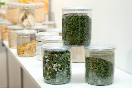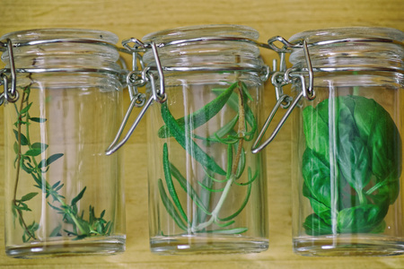glass jars filled with dried herbs, kitchen organization or cooking and pantry lifestyle themes
