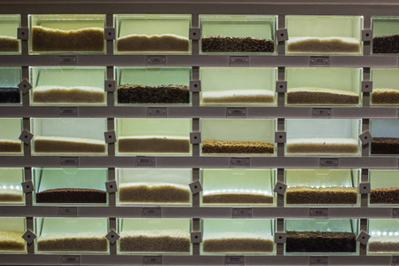 A wall-mounted grid of transparent containers displaying various grains and seeds, illuminated for educational or culinary use.