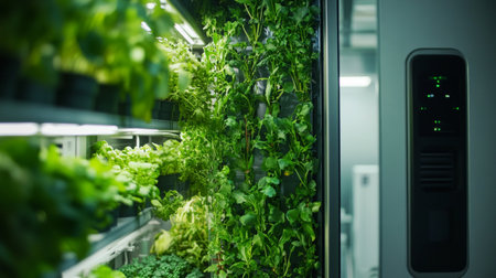 Smart vertical farm. Modern vertical farm with fresh lettuce and greens growing under LED lights. Smart indoor agriculture and hydroponics. Sustainable clean and efficient crop product in less area.