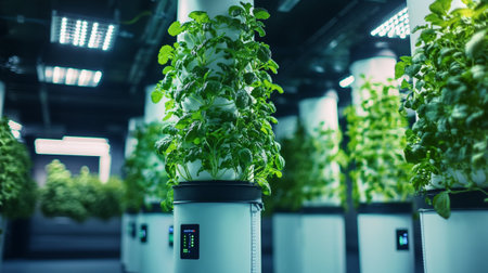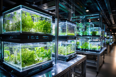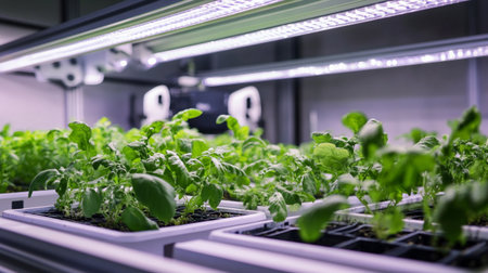 Rows of illuminated aquaponics systems display thriving plants in a modern indoor garden space.
