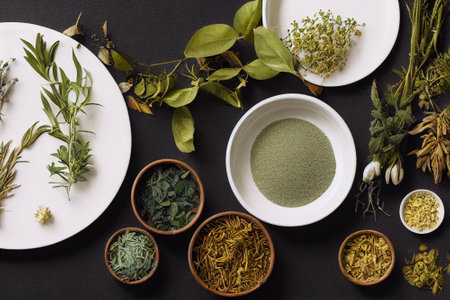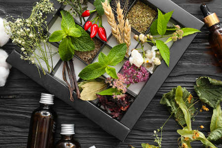 Collection of medicinal plants, herbs and flowers. Botanical assortment for homeopathy. Concept of natural remedies, alternative medicine, phytotherapy, green pharmacy and holistic healthcare.