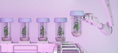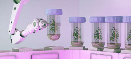 Robot hand working with seedlings in the laboratory. Concept of new technology.