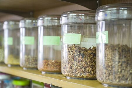 Close up Thai Herb for medicine in Traditioncal Thai Herb shop in Bangkok Thailand.