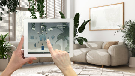 Smart remote home control system on a digital tablet. Device with app icons. Wooden minimal white living room with houseplants, urban jungle interior design