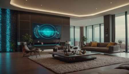 Modern smart home dashboard in contemporary living room with smart TV display. That the image is generated using AI.