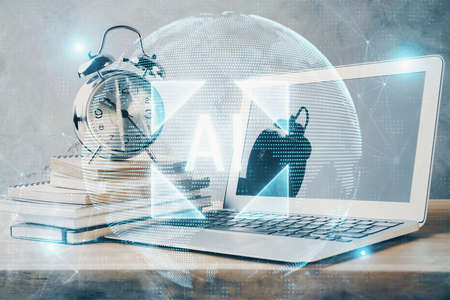 Double exposure of creative artificial Intelligence symbol with modern laptop on background. Neural networks and machine learning concept