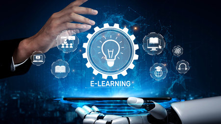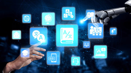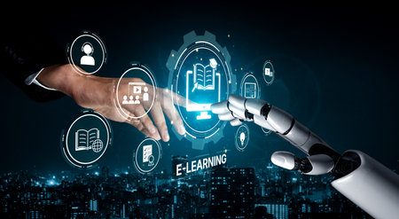 Robot finger and human finger touching on virtual artificial intelligence E-learning technology global network connection. Online education, webinar, Futuristic technology transformation.