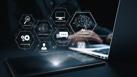 AI learning system involves deep learning, supervised machine learning, and natural language processing. AI learning diagram shows how AI advances in automation and data processing.