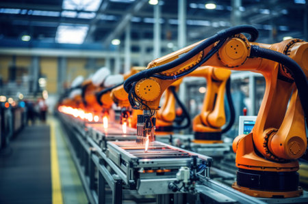 Advanced industrial robots working in a high tech manufacturing facility, showcasing precision, modern technology, and automation in industry