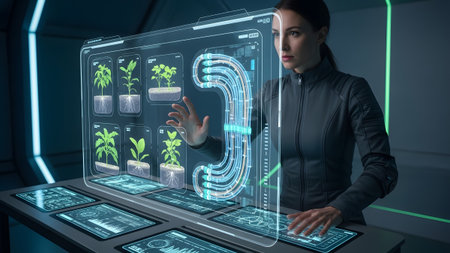 A scientist monitors advanced plant cultivation in a futuristic lab with holographic interface