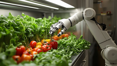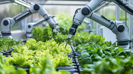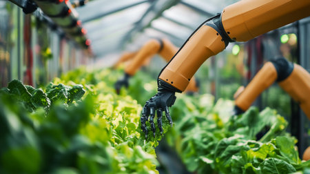 Close-up of a robotic hand working in a hydroponic greenhouse