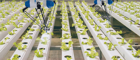 Industrial robot working in hydroponic farm,Smart factory concept