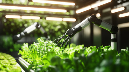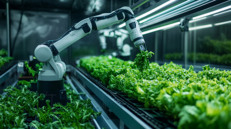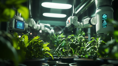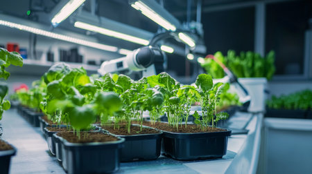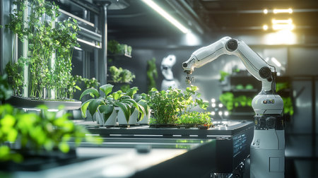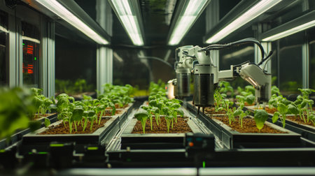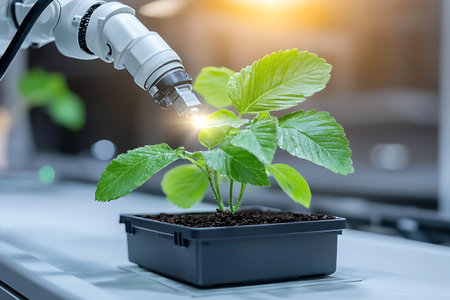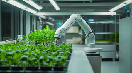A robotic arm gently nurtures a vibrant green plant in a controlled environment, showcasing the intersection of technology and sustainable agriculture practices.