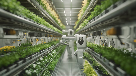 3d rendering robotic arms working in a hydroponic plant nursery