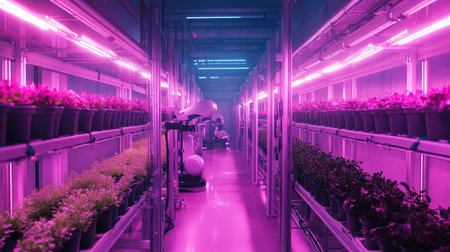 Young seedlings growing under pink-hued led lighting in vertical farming setup, demonstrating cutting-edge agricultural technology for efficient, sustainable crop cultivation