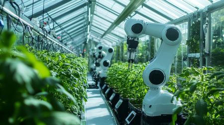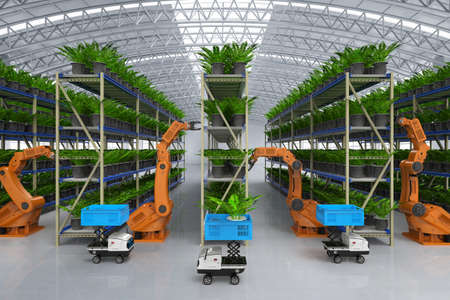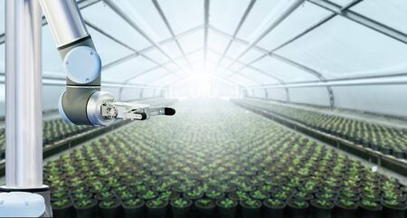 Agriculture technology concept with 3d rendering robotic arm in greenhouse