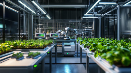 Industrial robot working on hydroponic farm, artificial intelligence and machine learning concept