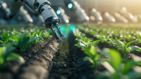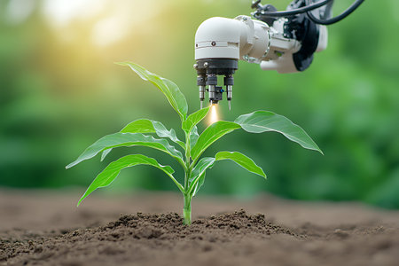 A futuristic robotic arm gently nurturing a green plant in fertile soil, symbolizing the intersection of agriculture and advanced technology under warm sunlight.