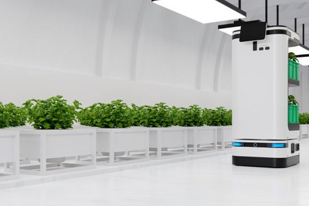 Smart industry robot working in hydroponic farm, artificial intelligence and machine learning concept.