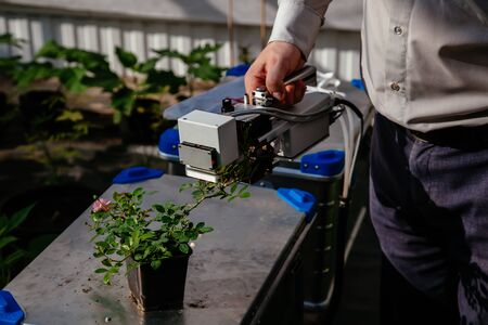Scientist measuring plant photosynthesis young rose by using carbon dioxide measuring device