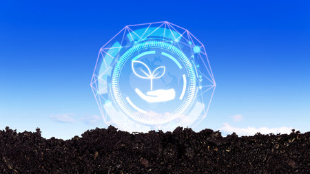Cradling gardener hands nurturing seedling in outdoor garden bed, with digital environmental icons. Sustainability, eco-friendly, horticulture, renewable, growth, conservation, digital agriculture