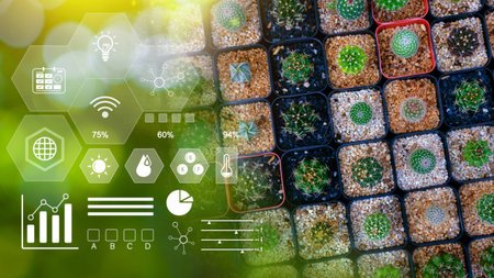 Miniature succulent cactus with infographics, Smart farming and precision agriculture with visual icon, digital technology agriculture and smart farming concept.
