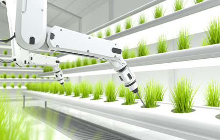 3d rendering of robotic arm working in hydroponic farm.