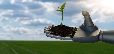 3d rendering robot working with seedlings in the field. Technology concept