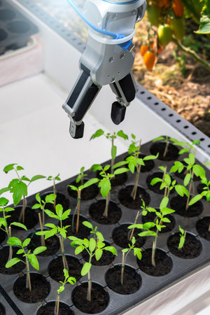 Biotechnology concept. Industrial robotic arm working with seedlings in greenhouse