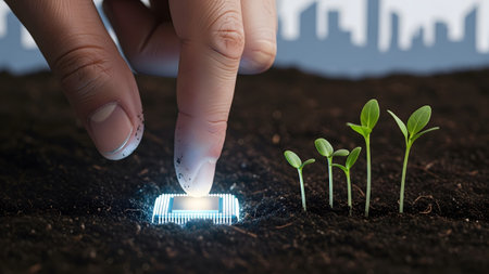 A finger presses a glowing microchip embedded in dark soil next to small green sprouts under a...