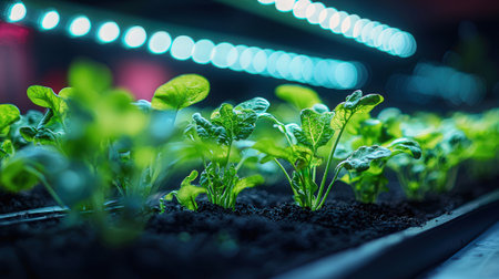 Organic hydroponic vegetable cultivation in greenhouse with LED lights.