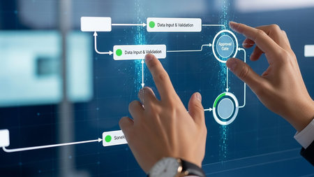 Hands interact with a digital workflow diagram on a blue screen, showing data input and approval gates.
