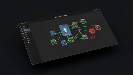 The a digital interface displayed on a tablet screen. The interface a central node labeled Trigger connected to several other nodes through green and red lines, indicating different types of connections or flows. The nodes are arranged in a network-like structure, suggesting a programming or software development environment. The background is dark, highlighting the bright colors of the nodes and lines.