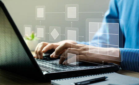 Hands on Laptop Focusing on Process Automation Concepts and Data Visualization in a Modern Office Environment. Asymptotic smart data analytic.