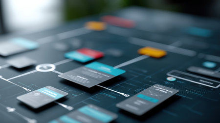 Futuristic data flow diagram showcasing a complex network of connections and elements. Ideal for technology concepts and digital visual communication.