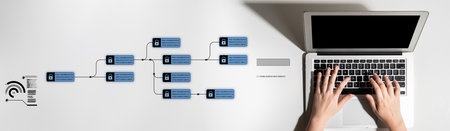Businesswoman typing in laptop, workflow chart with business icons and arrows double exposure on screen. Block diagram for maximizing efficiency and analysis. Concept of work process