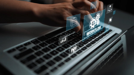 Professional Hands Typing on Laptop with Digital Process Automation Graphics for Business Efficiency and Innovation. Asymptotic smart data analytic.