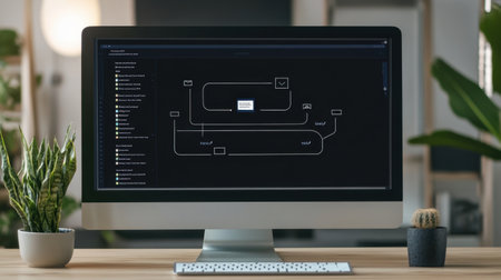 Business process and Automate workflows with flowcharts Business process management, business hierarchy The relationship of positional order and algorithm with a flowchart on a computer screen