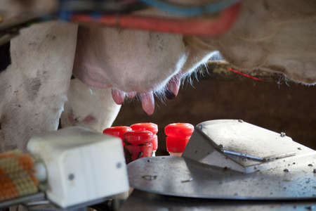 Milking a cow with milking machine