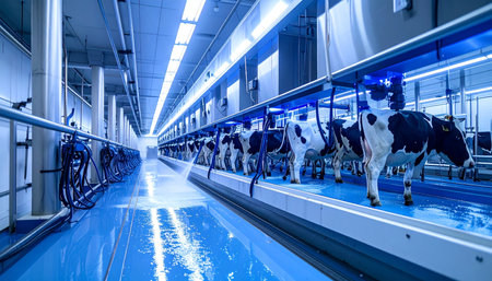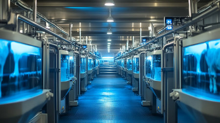 In a glimpse into the future of agriculture, a line of Holstein cows stands calmly in a state-of-the-art automated milking parlor. The facility, bathed in a cool blue light, showcases the pinnacle of efficiency and technological innovation in the modern dairy industry.