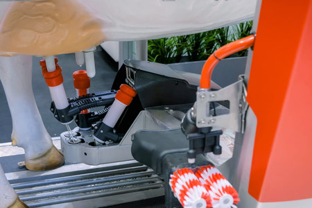 Automatic cow milking device after producing milk in technological cowshed close up. Modern dairy production equipment on computerized robotic barn. Smart manufacture fresh organic production concept.